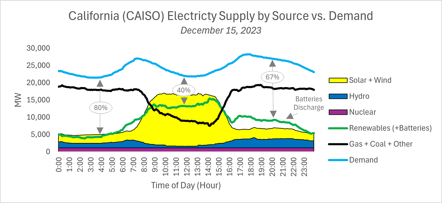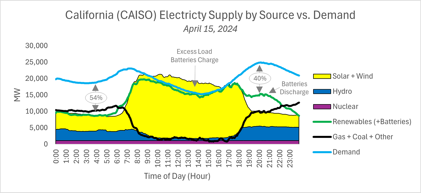 In the evenings, gas and coal generation (black line) is needed to offset the decline in solar supply and meet demand. Batteries can store electricity when supply exceeds demand and provide power later in the day (green line). There is still a 40%+ gap in the evenings and mornings for renewable supply to meet demand.