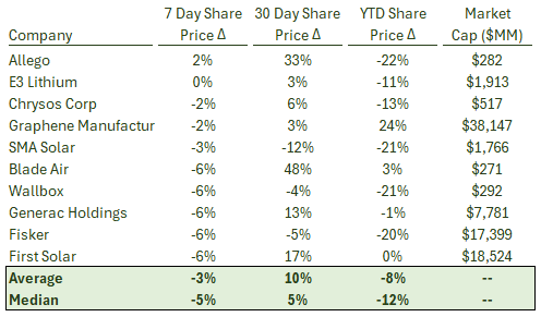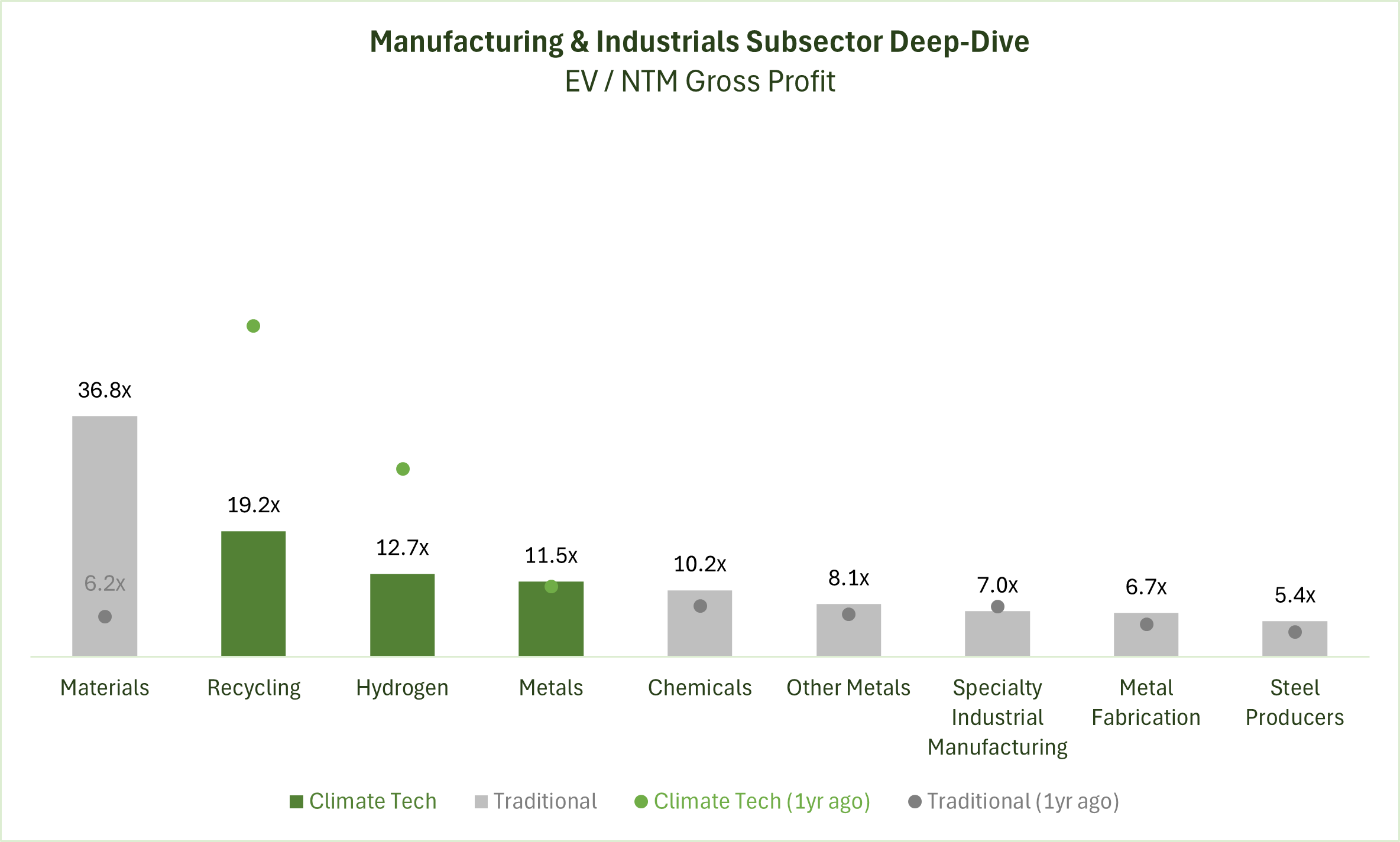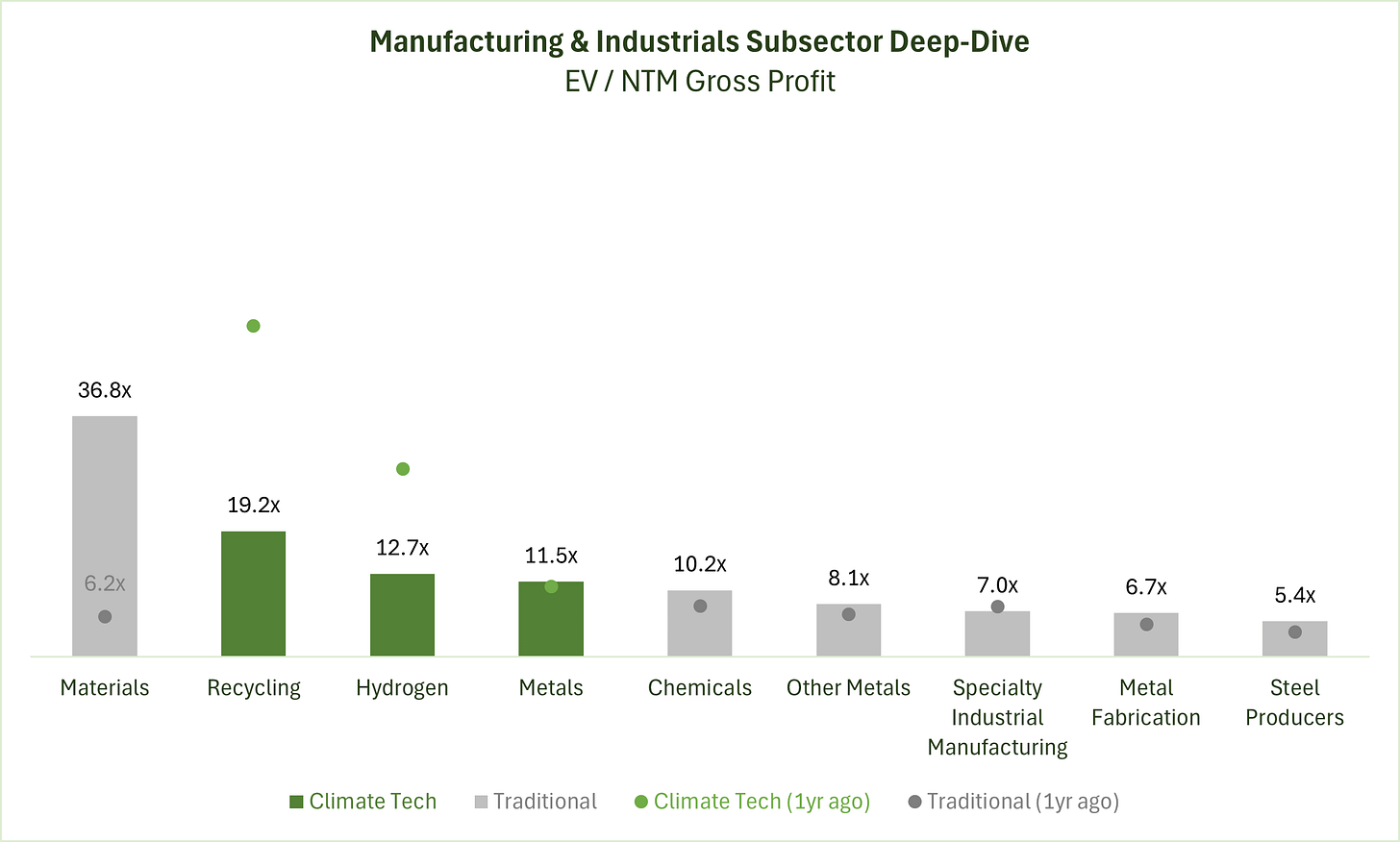 Manufacturing & Industrials: Both traditional and emerging companies around critical minerals supply command a premium; the market has grown skeptical on hydrogen.