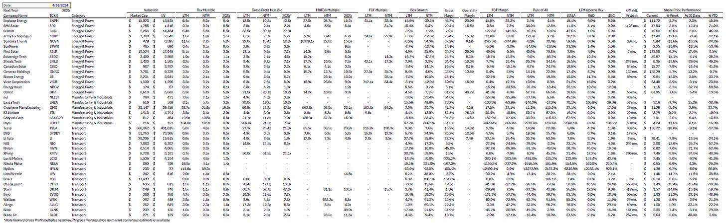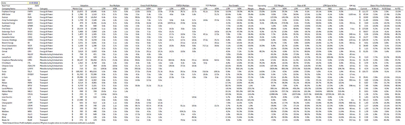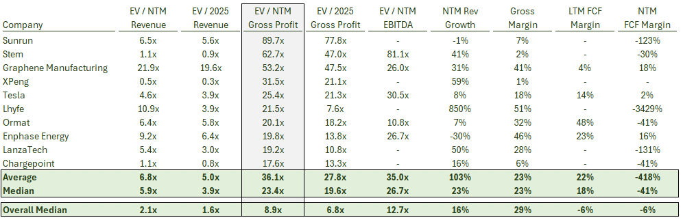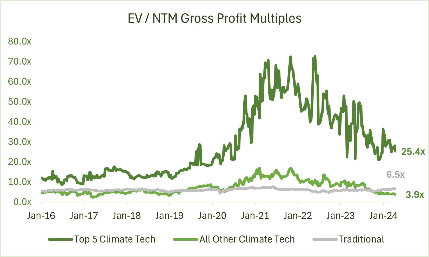 While technology companies are typically valued on Next Twelve Months (NTM) Revenue, traditional industrial businesses are often valued on Last Twelve Months (LTM) EBITDA. Due to the varied business models across climate tech (and the fact that many of the companies are not yet EBITDA positive) valuation multiples here are calculated based on Next Twelve Months (NTM) Gross Profit.