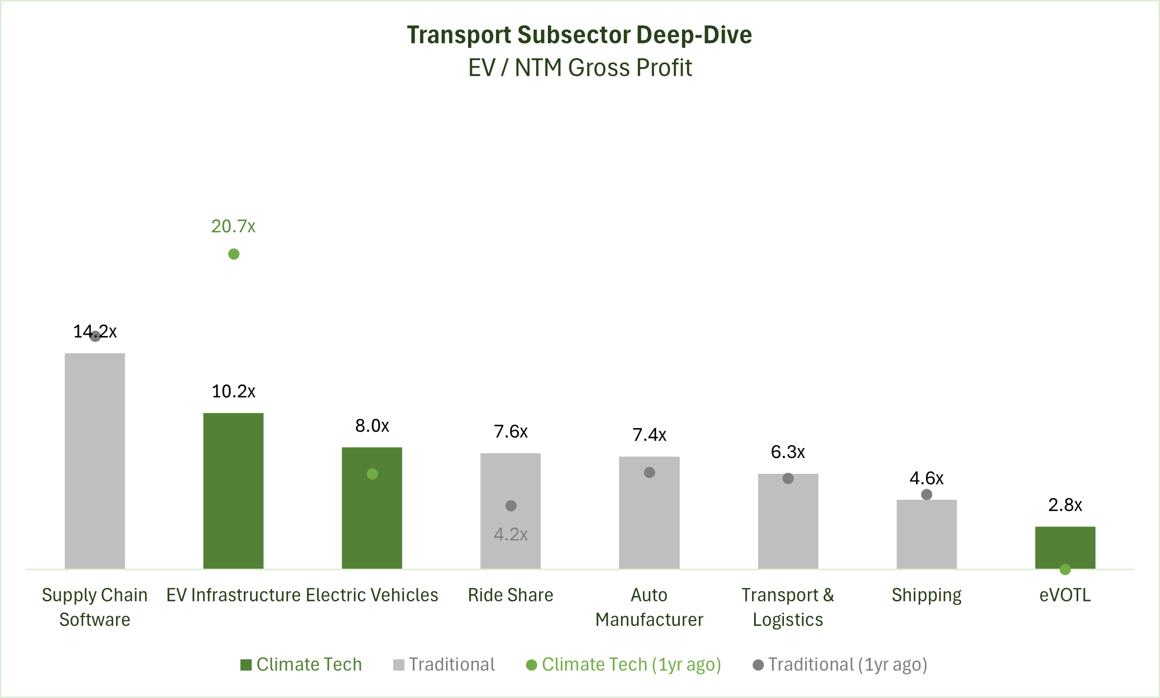 Transport: EV growth is priced in to climate tech and traditional companies; the market is skeptical on eVOTL.