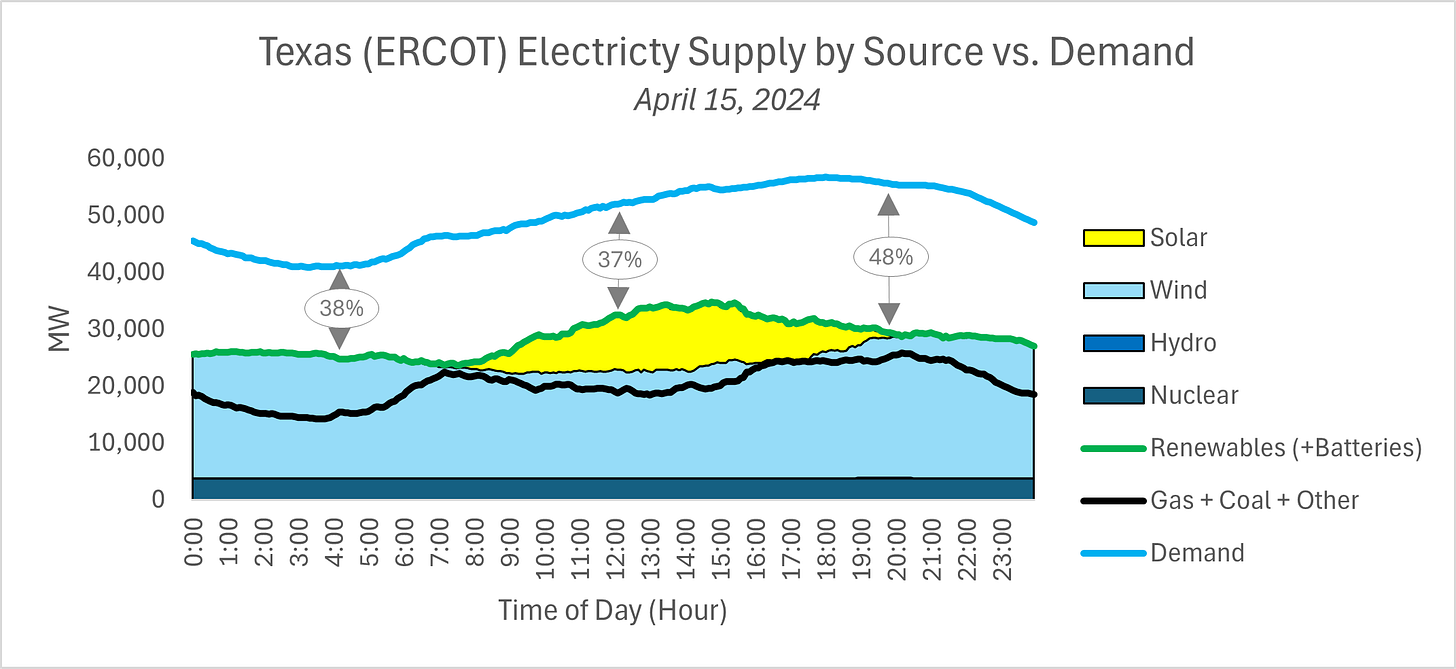 Other markets (like Texas) will have a much easier (and more profitable) path to deploy more renewables. Texas electricity demand does not dip in the middle of the day (known as the ‘Duck Curve’) due to less prevalent residential solar, more industrial consumption using 24x7 power, and other factors. Texas electricity demand is higher (~2.5x California’s) and so is its current solar + wind supply (~2.4x). Because Texas has more wind, it has a longer runway to deploy more renewables without needing storage.