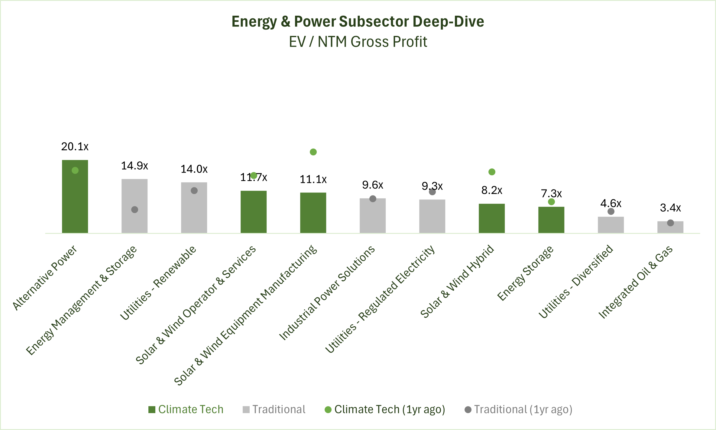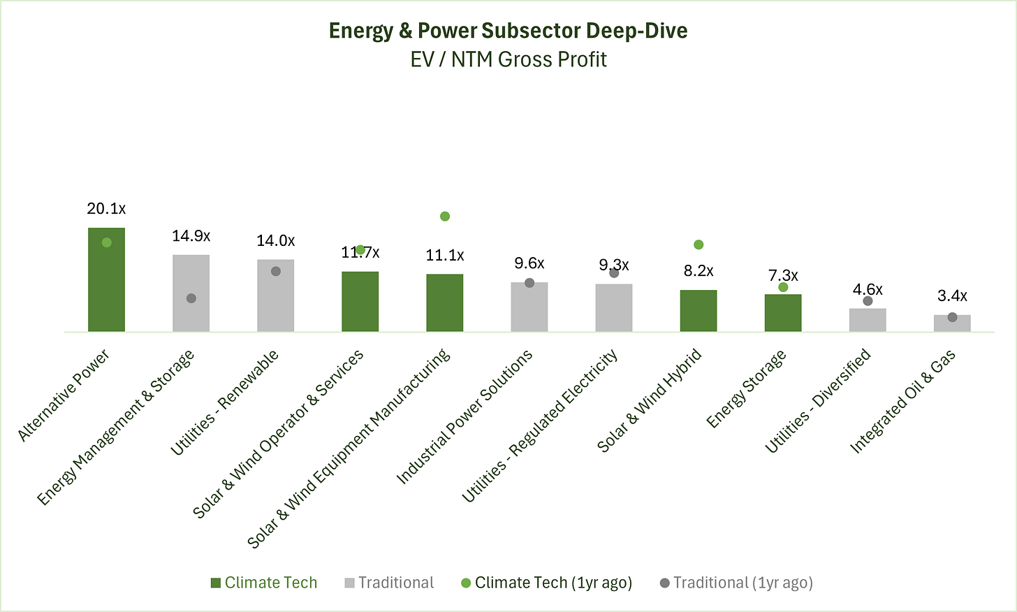 Energy & Power: Mature and bankable climate tech (pure-play solar & wind, alt. power) commands a higher premium, while more speculative (storage) has less; the market is more skeptical on hybrid solar & wind business models (combining manufacturing with services or operations).