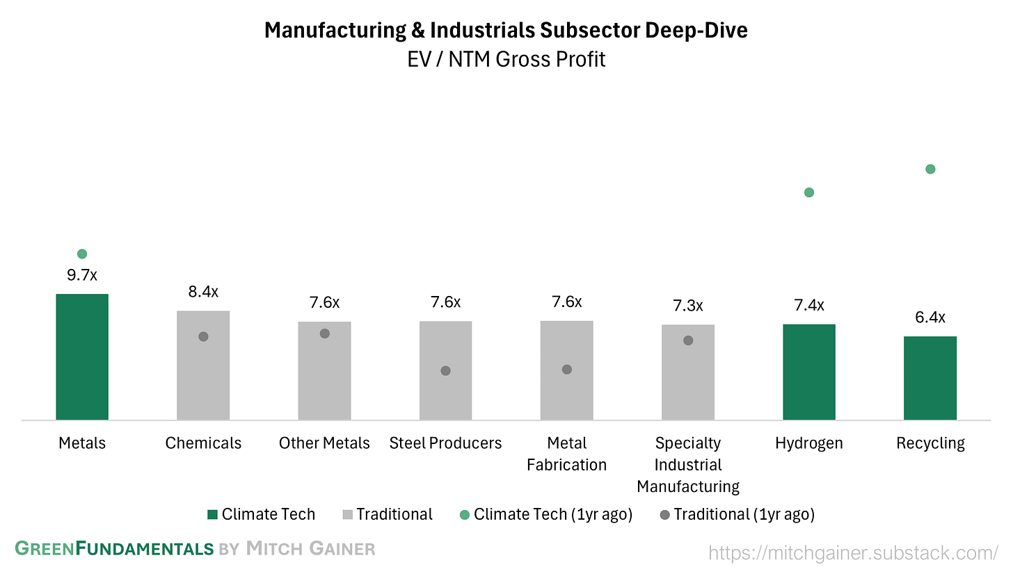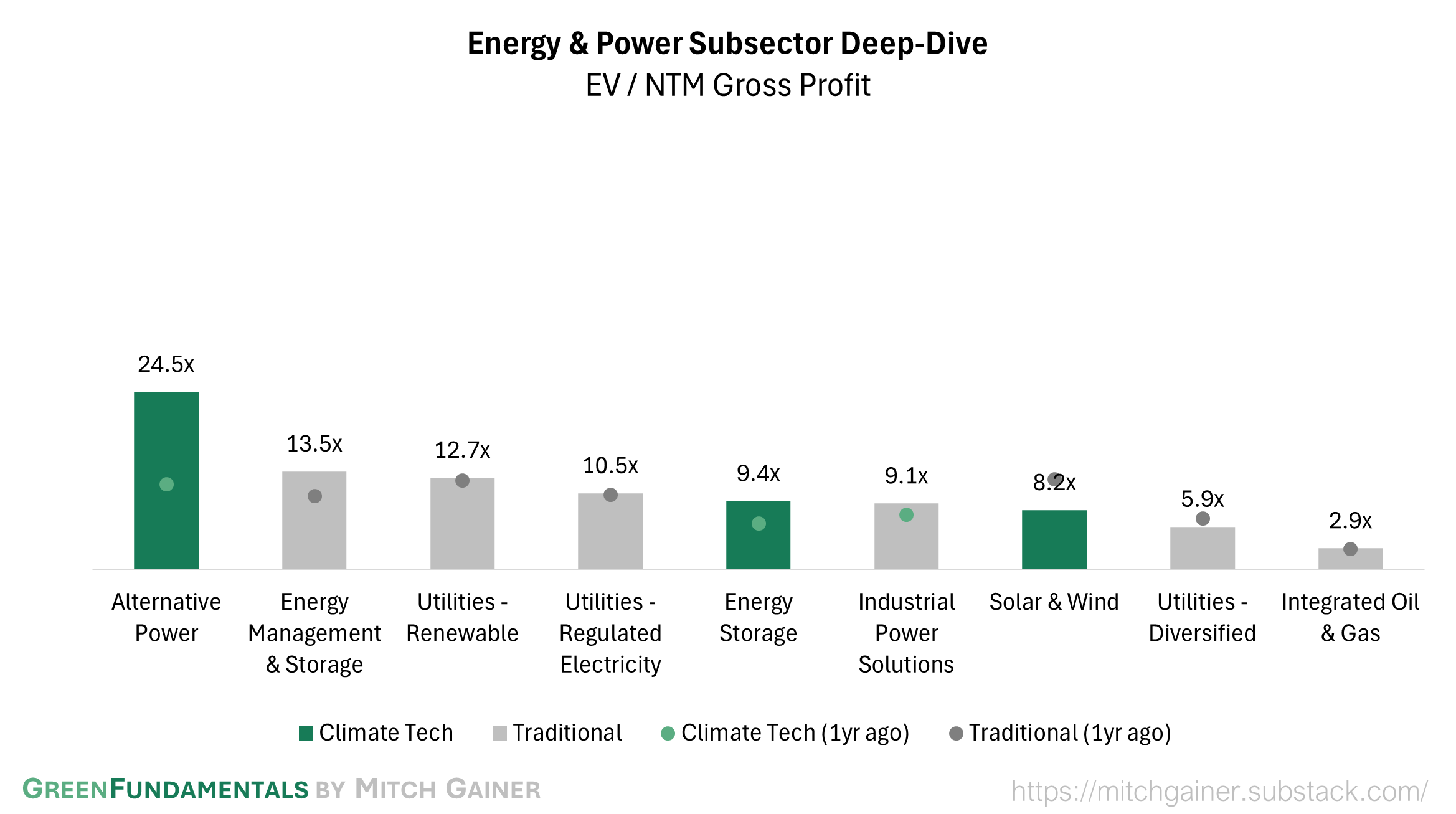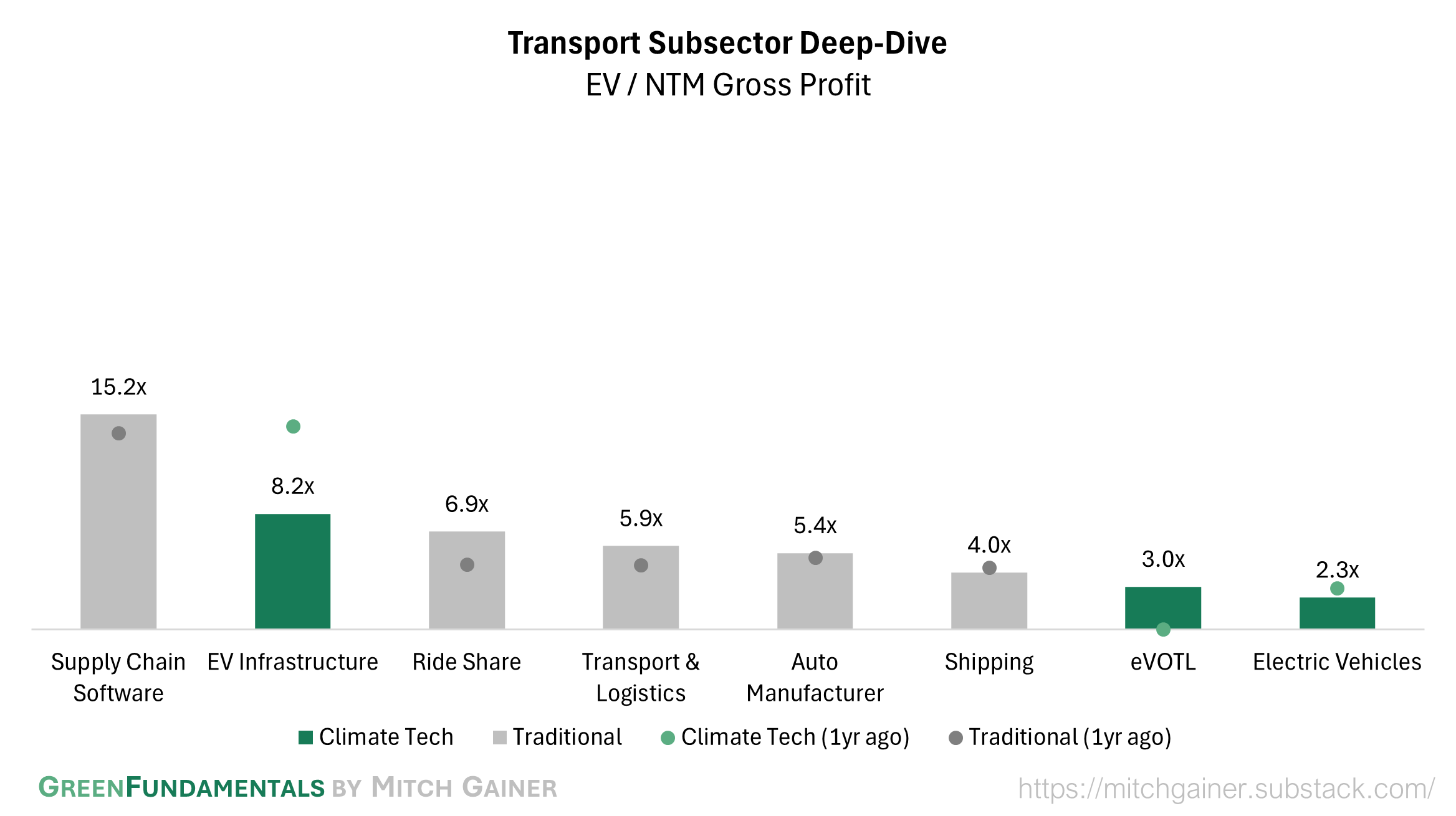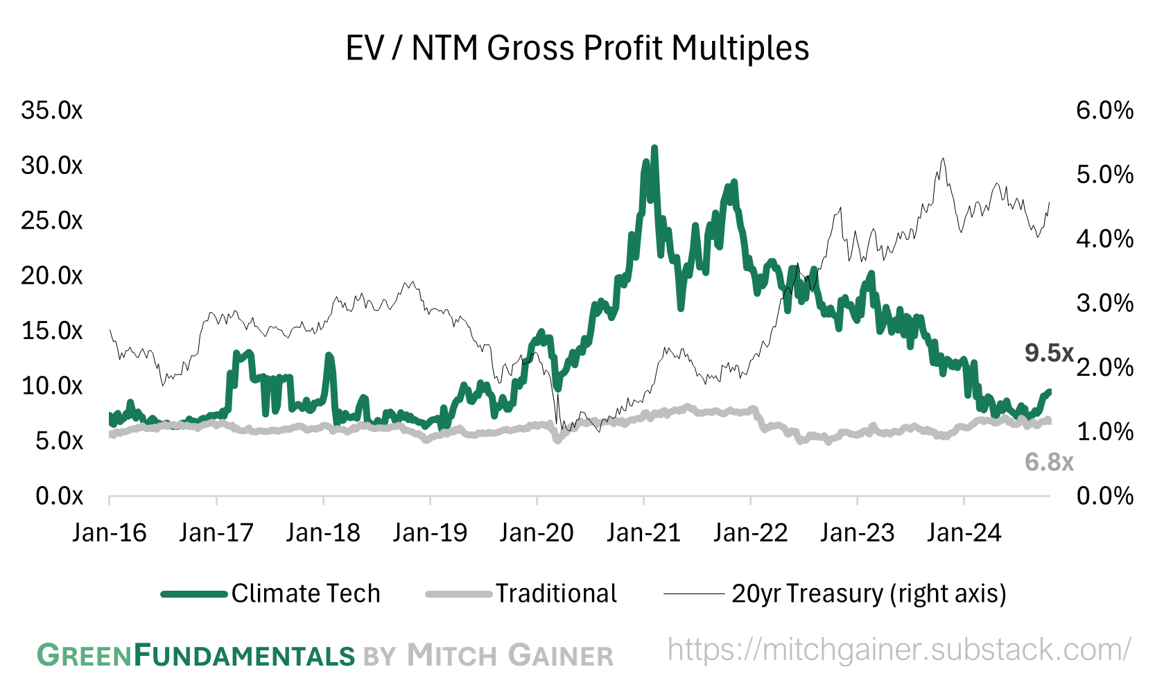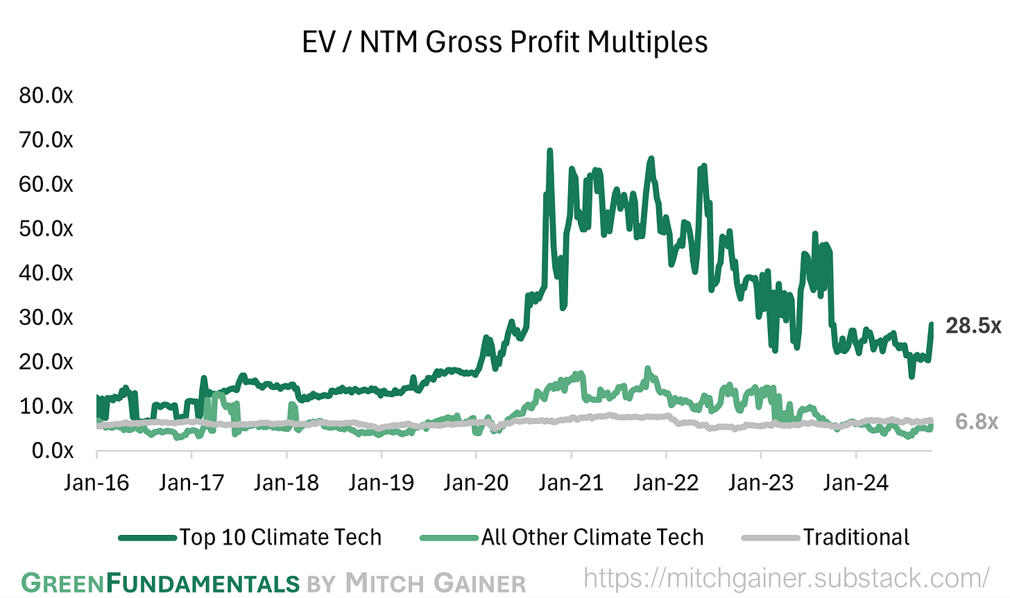 While technology companies are typically valued on Next Twelve Months (NTM) Revenue, traditional industrial businesses are often valued on Last Twelve Months (LTM) EBITDA. Due to the varied business models across climate tech (and the fact that many of the companies are not yet EBITDA positive) valuation multiples here are calculated based on Next Twelve Months (NTM) Gross Profit.