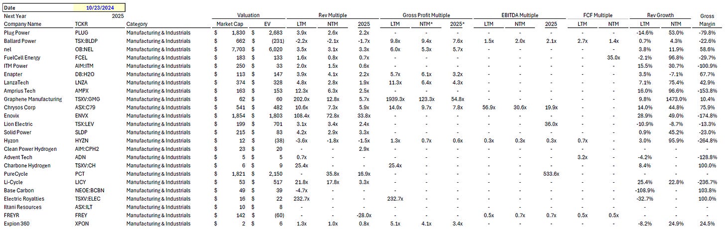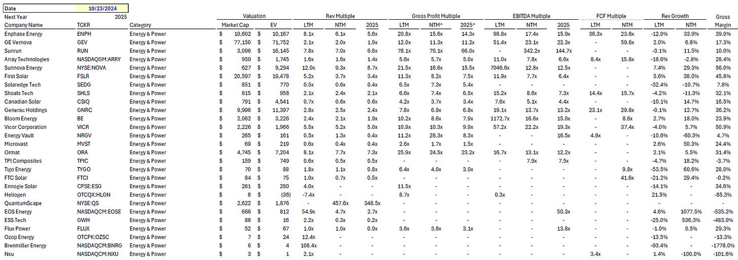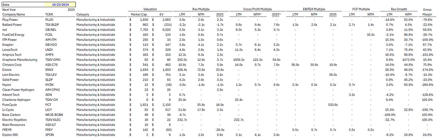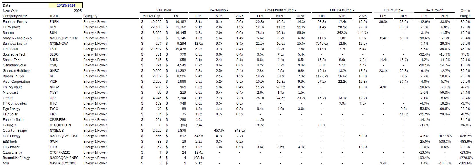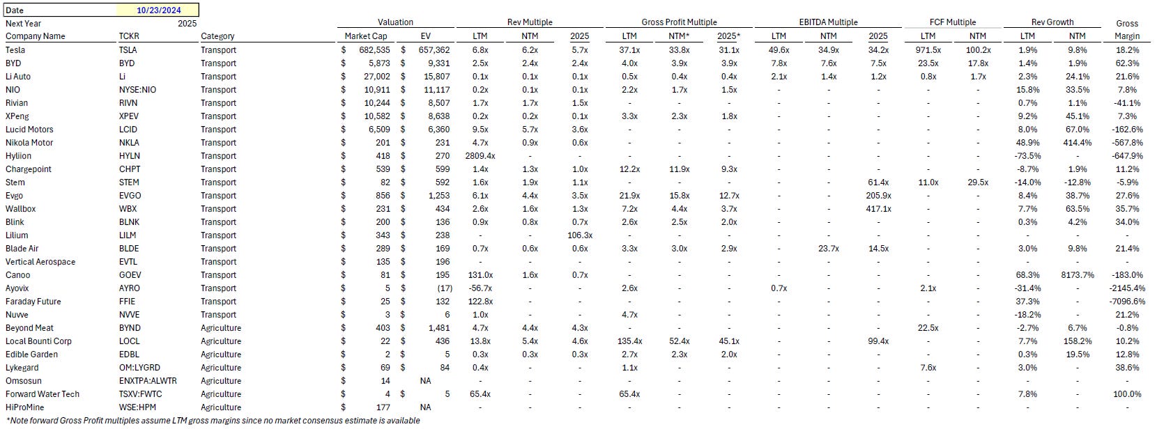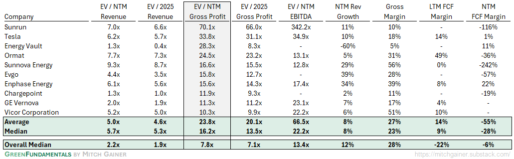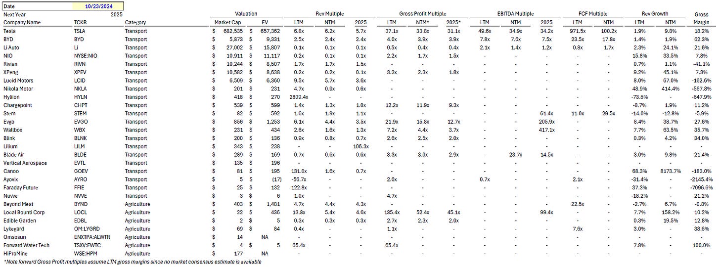 While technology companies are typically valued on Next Twelve Months (NTM) Revenue, traditional industrial businesses are often valued on Last Twelve Months (LTM) EBITDA. Due to the varied business models across climate tech (and the fact that many of the companies are not yet EBITDA positive) valuation multiples here are calculated based on Next Twelve Months (NTM) Gross Profit.