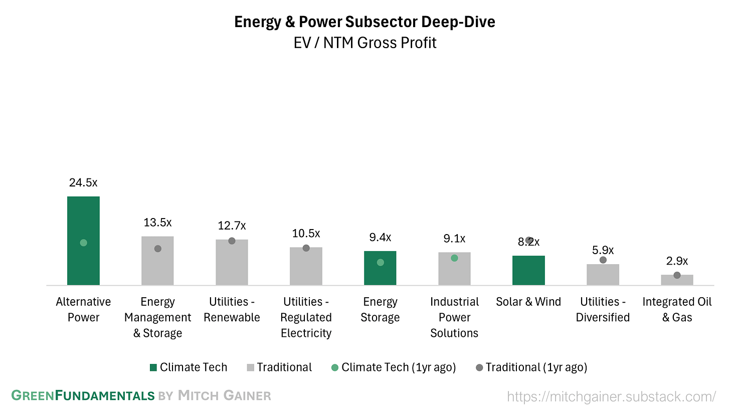‘Climate Tech’ includes (1) any pure-play climate technology company that (2) has more than $200M market cap and (3) has positive revenue as well as gross profit (see sector deep dives for full list). ‘Traditional’ includes legacy market participants in relevant sectors (see sector deep dives for full list).